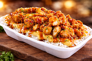 tortilla, crevettes panées, cheddar fondu, légumes, laitue, piment rouge, oignons croustillants guacamole, chornichons, jalapenos, sauce maison blanche à l’ail et sauce poivrons rouge
